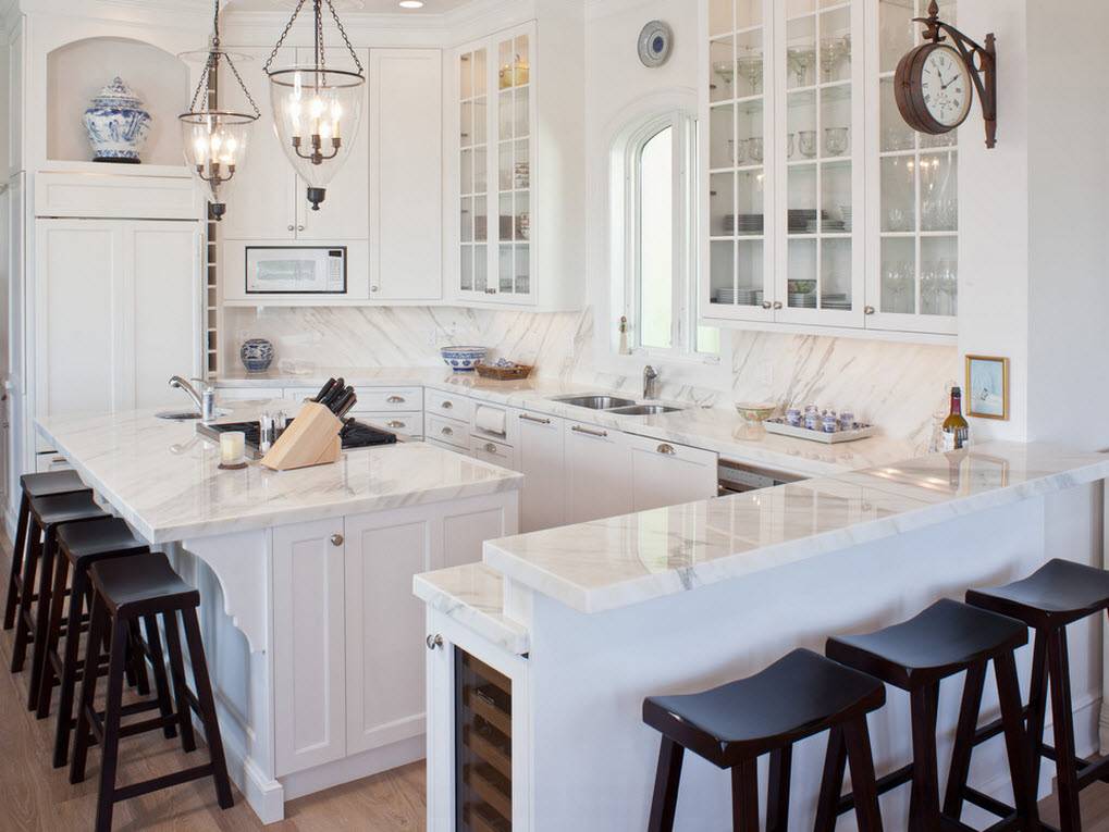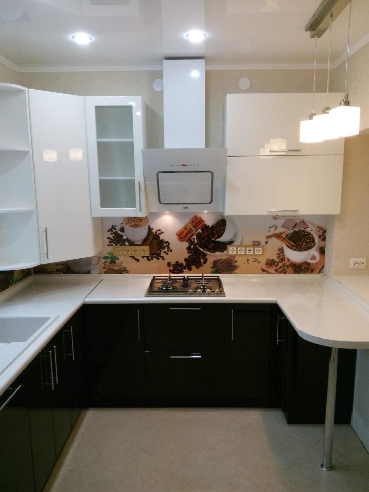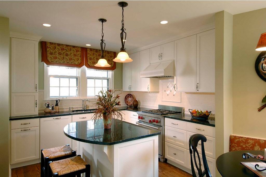 Выбирая подобный дизайн гарнитура следует обращать внимание на ширину образовавшегося прохода. Нельзя чтобы он был слишком узким или напротив очень широким