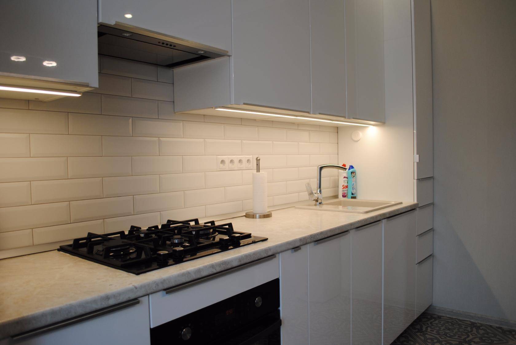 Отдельно стоящая мебель и техника может не подходить под габариты тумб и шкафов. Со встроенной таких проблем не будет: по стандарту ее ширина 60 или 90 см. Большой плюс встроенного варианта – цельная столешница, без зазоров и щелей между тумбами.