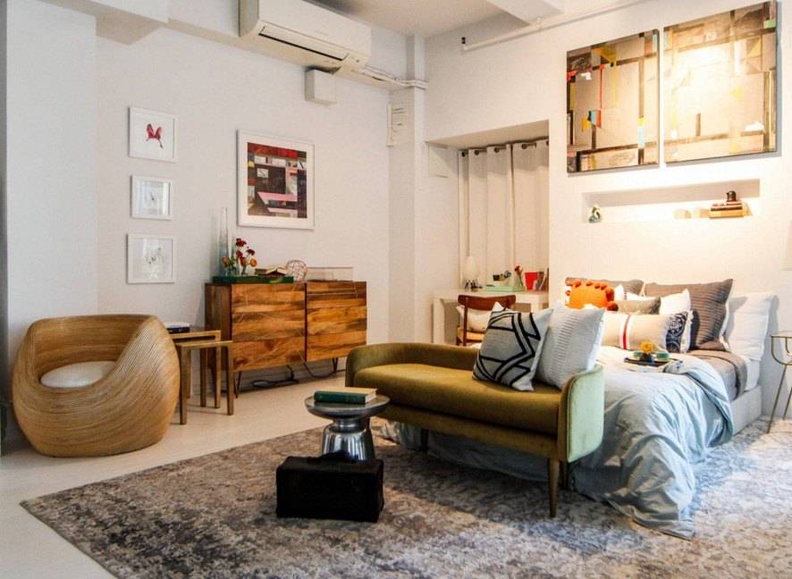 В интерьере спальни-гостиной 20 кв. м неплохо смотрятся экраны и ограждающие перегородки. Они могут быть стилизованными, разноцветными, сплошными. Занавеси тоже можно использовать в качестве зонаторов. Отделить одну область от другой можно ещё при помощи предметов мебели.
