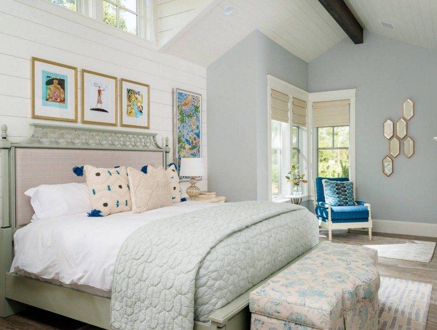 Светлая спальня лучше будет смотреться в Греческом направлении стиля: белые стены, пол теплых тонов, деревянная мебель, много текстиля в серо-голубых и синих тонах.