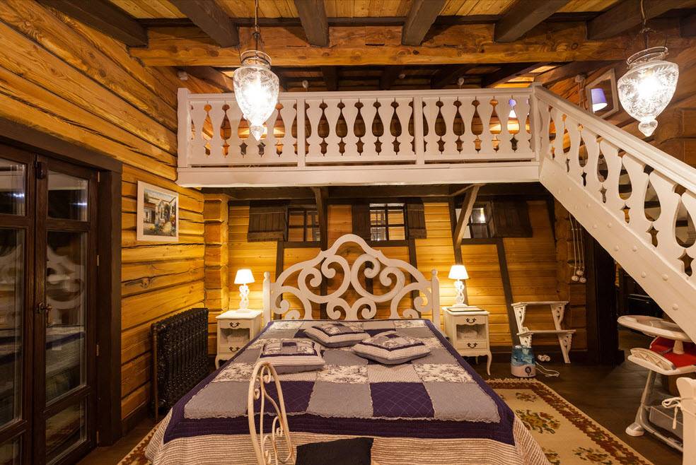 Главный строительный материал – оцилиндрованное бревно, брус. Воздух в таком доме насыщен полезными ароматами древесных смол, микроклимат максимально благоприятен для человека. Дерево хорошо держит тепло, зимой защищает от холода, летом от зноя. Отличительная особенность во внешнем облике – бревенчатые элементы, из которых сложено крыльцо, покатая крыша, вырезаны красивые колонны. Если в других стилях внутренняя отделка комнат обязательна, то здесь она отсутствует; это сохраняет единство оформления снаружи и внутри жилого здания.