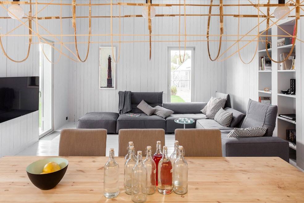 Восхищение вызывает цветовые приёмы. Характерная желтизна дерева скрыта под слоем светло-серого тона, благодаря чему дом стал светлее и свежее. Особого внимания заслуживают сосновые буфеты и стеллажи. Игра цветов сыграла в этом значимую роль, ведь и внутри, и снаружи они абсолютно разные: бирюзовые, древесные и белые тона оттеняют и дополняют друг друга. Интересное решение зонирования: подвесные качели отделяют кухню-столовую от гостиной.
