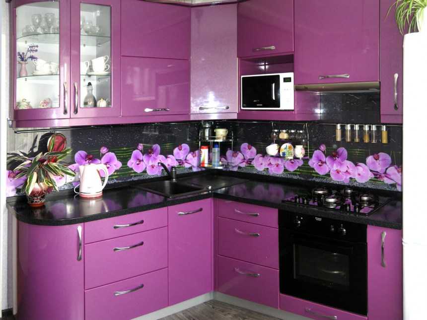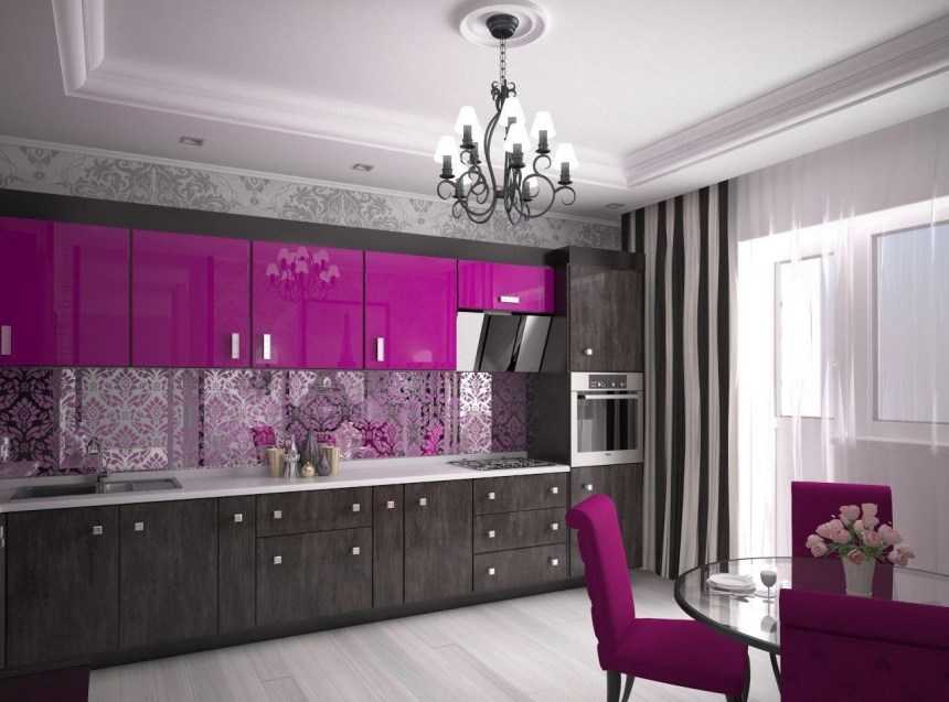 Модный вариант — современная П-образная кухня с глянцевыми лиловыми фасадами и с белыми столешницами. Такой гарнитур удобен за счет широкой рабочей поверхности. Рекомендуем приобрести встроенную бытовую технику, чтобы создать целостную композицию.