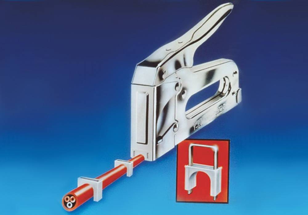 Если в вашем хозяйстве имеется степлер, закрепить небольшого диаметра низковольтный кабель можно легко и быстро. В продаже есть специальные U-образные скобы. Они предназначены как раз для этих целей. Бывают двух типов: