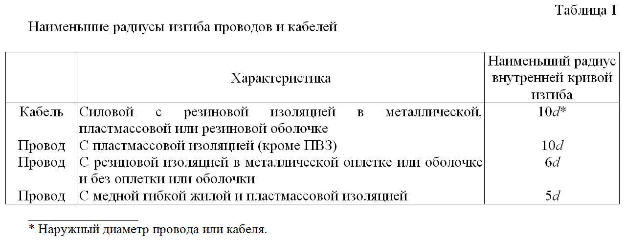 - При отклонении кабеля или провода в сторону от струны радиус делается соответственно значениям, указанным в Таблице 1: