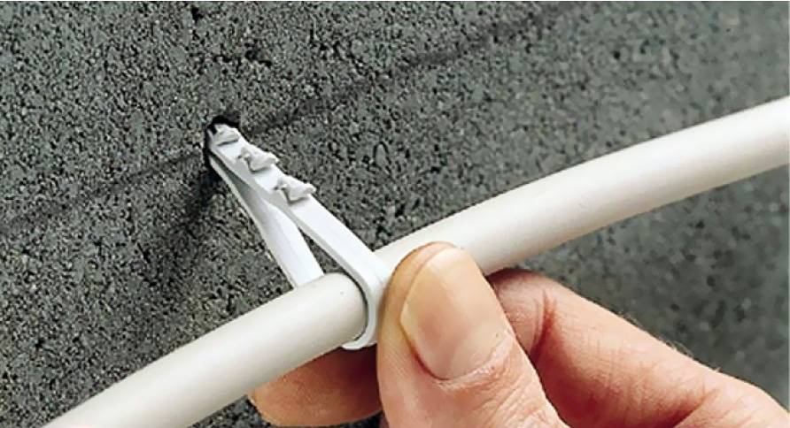 После того как клипсы установлены, трубу или рукав просто вставляют в них, прижимая до защелкивания. Некоторые модели имеют дополнительные стяжки, закрывающие крепление кабеля сверху (см. фото).