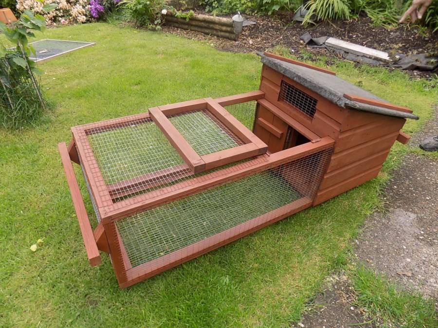 В нём можно содержать взрослых особей, самку с детёнышами. По длине весь блок должен быть 140 см, а по ширине около 70 см. Особенность заключается в разной высоте задней и передней стенки крольчатника: из-за этого пол расположен под наклоном, что делает удобной уборку жилища. Он может быть сделан как из досок, так и из сетки. Кормушки и поилки расположены внутри.
