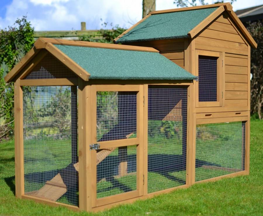 Пол делают из реек, которые укладывают через небольшие промежутки. Это позволяет отходам стекать по желобам в специальную емкость. Стенки изготавливают из дерева, дверцы – из сетки. Для лучшего притока воздуха жилище оборудуют вентиляционной трубой, прикрытой козырьком.