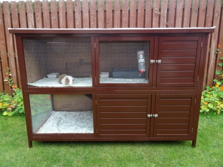 Кроличий дом может быть двухсекционным. Конструкция может быть выполнена как из дерева, так и из металлической сетки.