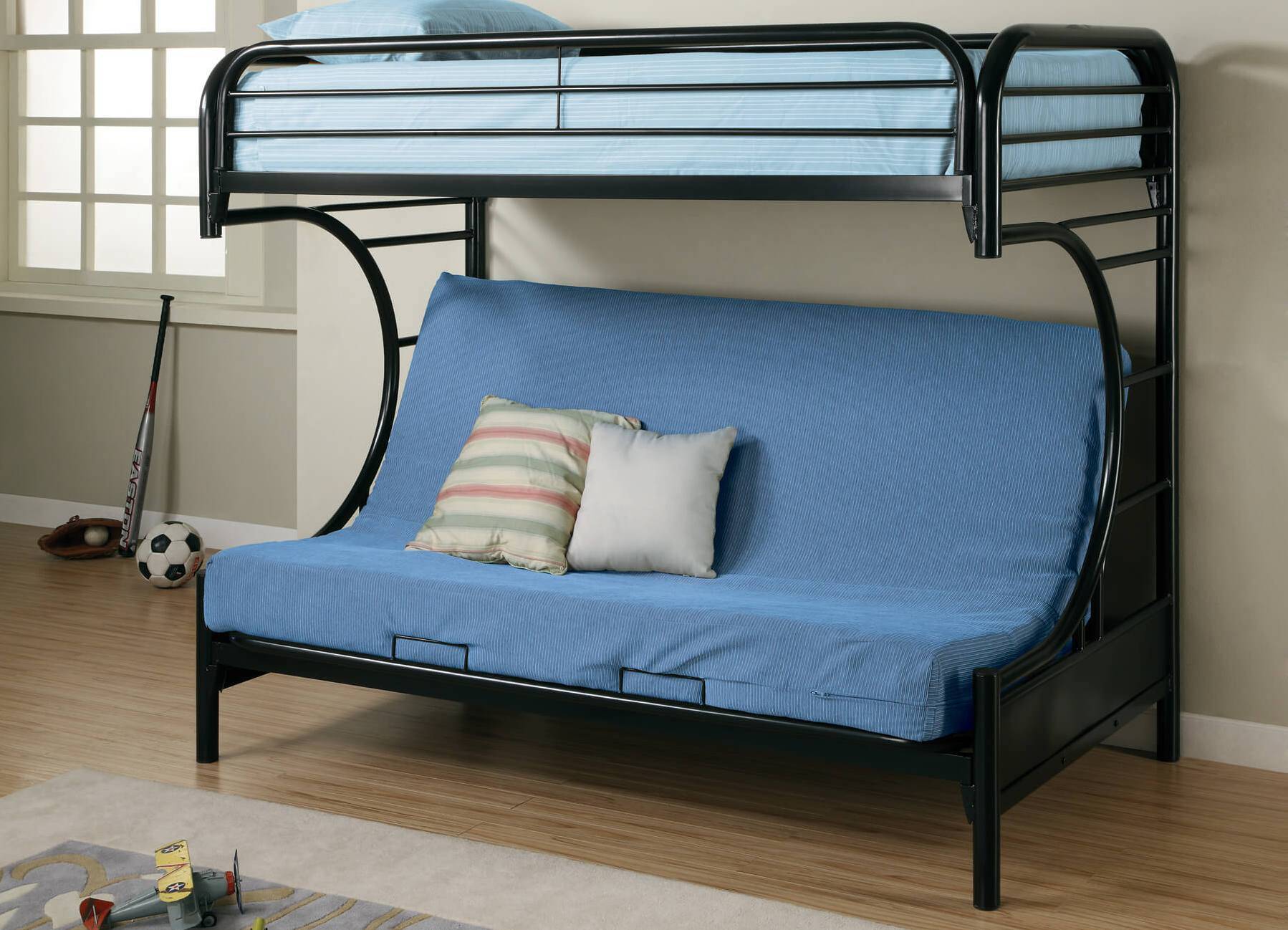 Если семье с двумя детьми приходится жить в одной комнате, которая одновременно служит и гостиной, и спальней, то спасательным кругом становится двухъярусная модель, которая складывается в комфортный и вместительный диван.