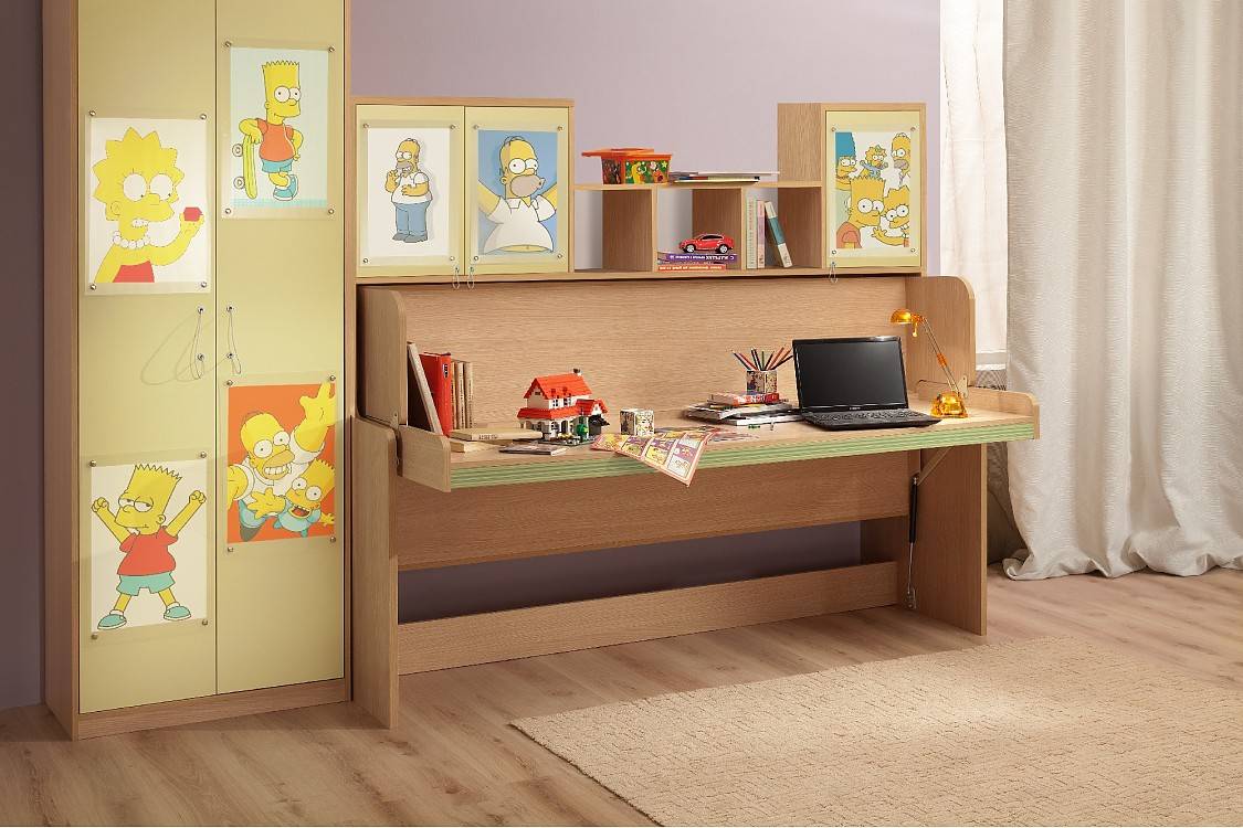 Еще один многофункциональный детский вариант — откидная кровать-трансформер. Она может быть совмещена с комодом, шкафом и/или со столом. Различают два вида таких конструкций: