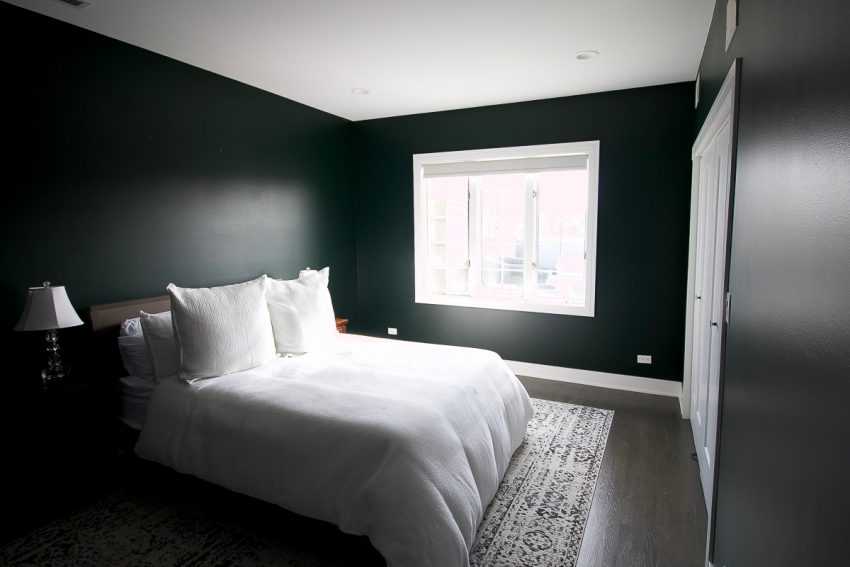 В случае использования белого цвета в качестве основного при отделке стен и потолка удачным вариантом станет размещение в спальне темной мебели.