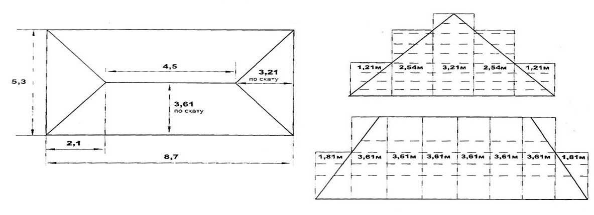 У вальмовых крыш скаты имеют треугольную или трапециевидную форму. Тут необходим подбор длины листа — чтобы минимизировать количество отходов.