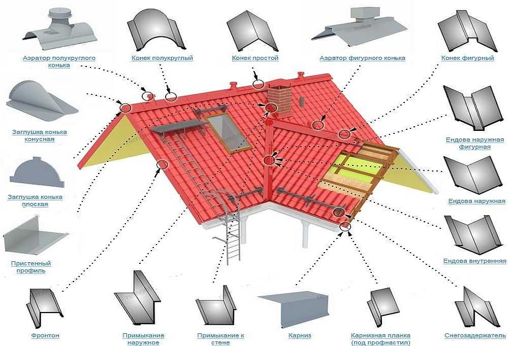 Устройство крыши из металлочерепицыпредполагает набор следующих дополнительных аксессуаров: