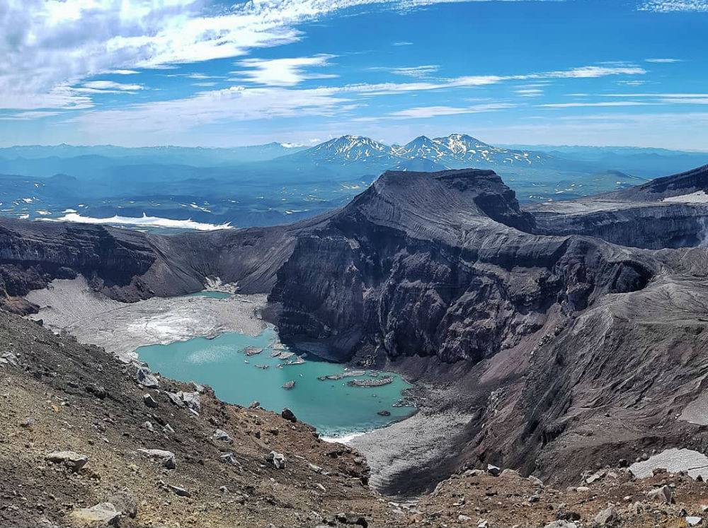 Вулкан Горелый часто называют хребтом из-за его вытянутой формы. Он несколько ниже своих соседей, Мутновского и Вилючинского вулканов, и со стороны не выглядит привлекательнее их, но всё меняется, когда поднимаешься на его вершину. В кальдере этого вулкана в линию выстроились несколько кратеров, у каждого из которых свои особенности и запоминающийся пейзаж. Единственный активный кратер так и называется — Активный — он самый впечатляющий, в глубине его воронки находится кислотное озеро ярко-бирюзового цвета, по краям которого постоянно поднимаются клубы сернистого газа. На дне самого большого кратера тоже есть холодное Голубое озеро с плавающими в нём льдинами. Треккинг до ансамбля кратеров занимает всего несколько часов, а пейзаж наверху совершенно сюрреалистичный.
