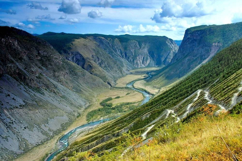 Одна из самых живописных, но в то же время и самых непростых дорог республики Алтай — это перевал Кату-Ярык, спуск с Улаганского нагорья в долину реки Чулышман. Серпантин с 9 крутыми поворотами и уклоном в 35° рисует на склоне линию, похожую на кардиограмму, можно представить себе, что именно так бьётся сердце великого Алтая. В самом начале спуска есть смотровая площадка, с которой открывается шикарный вид на величественные горы и утопающую в зелени долину реки. Увы, но спуститься вниз можно только на высоком полноприводном автомобиле, да и то довольно рискованно, поэтому у начала подъёма на всякий случай дежурит трактор.