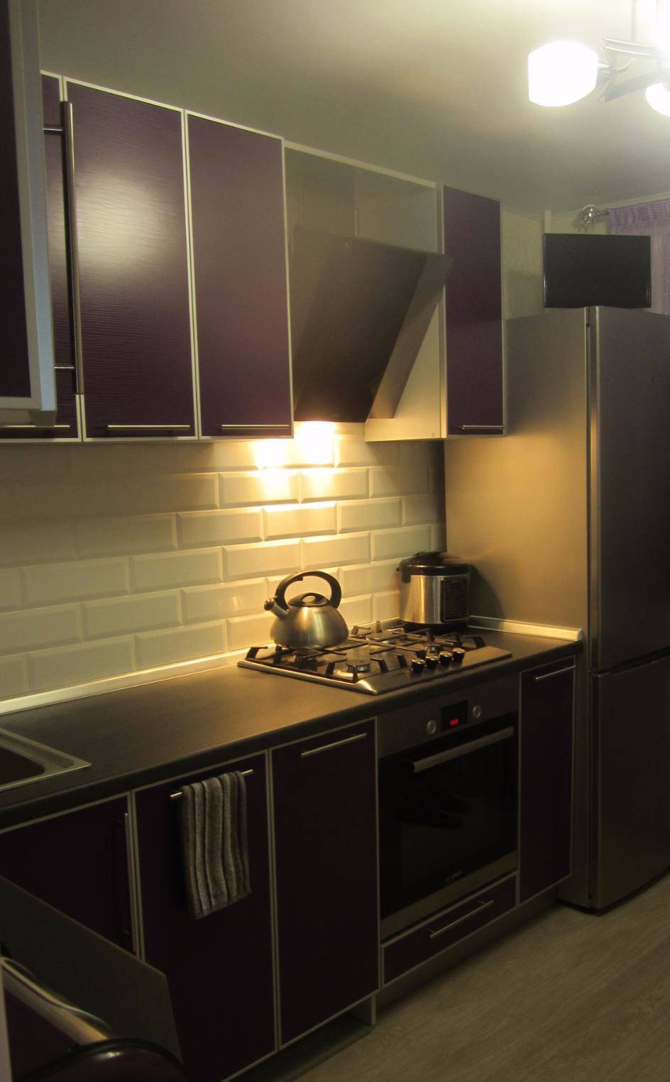 Кроме того, оттенок баклажана можно использовать в качестве подсветки — решение неординарное, но, определенно заслуживающее внимание. Лучше всего такой прием смотрится на белой, серебристой, бежевой кухне