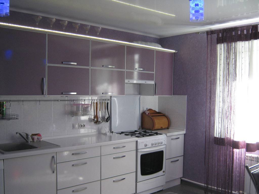 Сочетание бело-баклажанного дуэта в интерьере кухни
