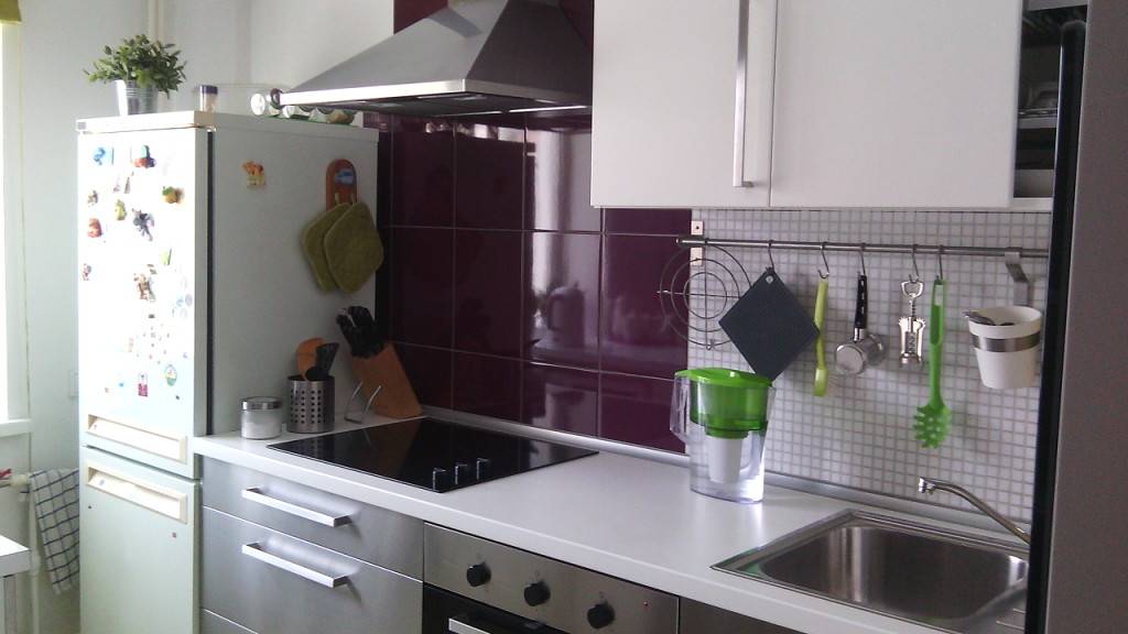 Материал для фартука может быть абсолютно любым: фальшпанели, окрашенное дерево, плитка — баклажан позволяет такие эксперименты. Однако если вы остановились на последнем варианте, придется очень тщательно замазать все швы. Иначе погрешности будут бросаться в глаза на ярком фоне.