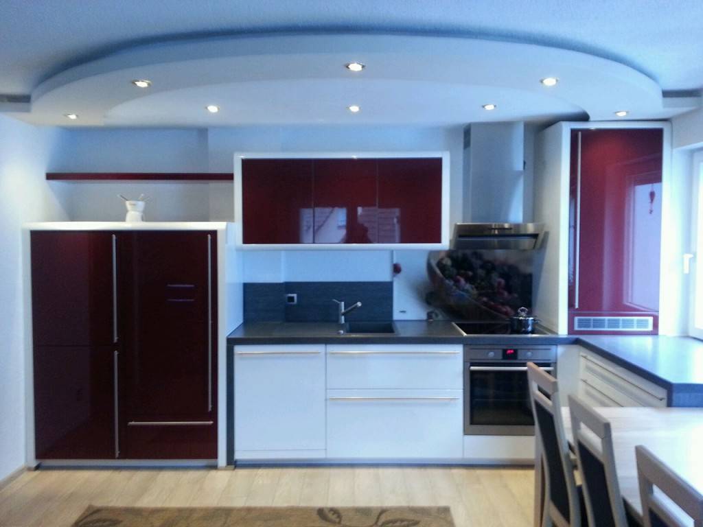 Потолок в этом варианте должен также остаться белым. Без этого органичный дизайн не получить. А вот обеденную мебель приобрести можно и черного тона. Все тот же глянец украсит кухонное пространство очень оригинально.