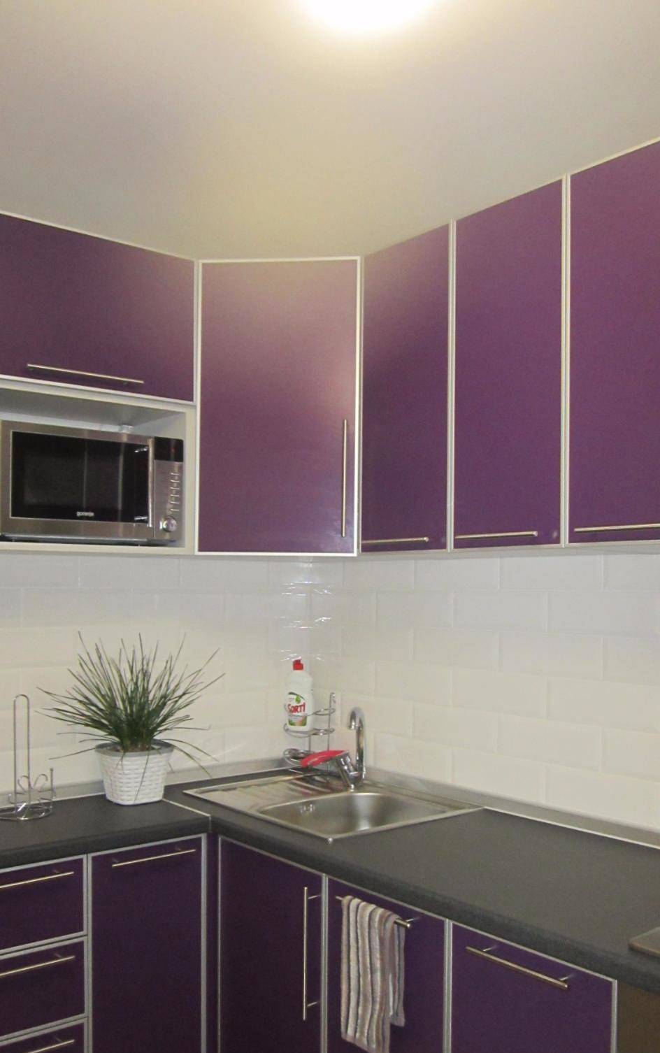 Очень оригинально смотрятся баклажановые столешницы с белыми или серыми фасадами. Правда, ухаживать за рабочей поверхностью придется очень тщательно — на баклажане видны даже малейшие пятна, особенно если вы остановились на глянцевой фактуре.