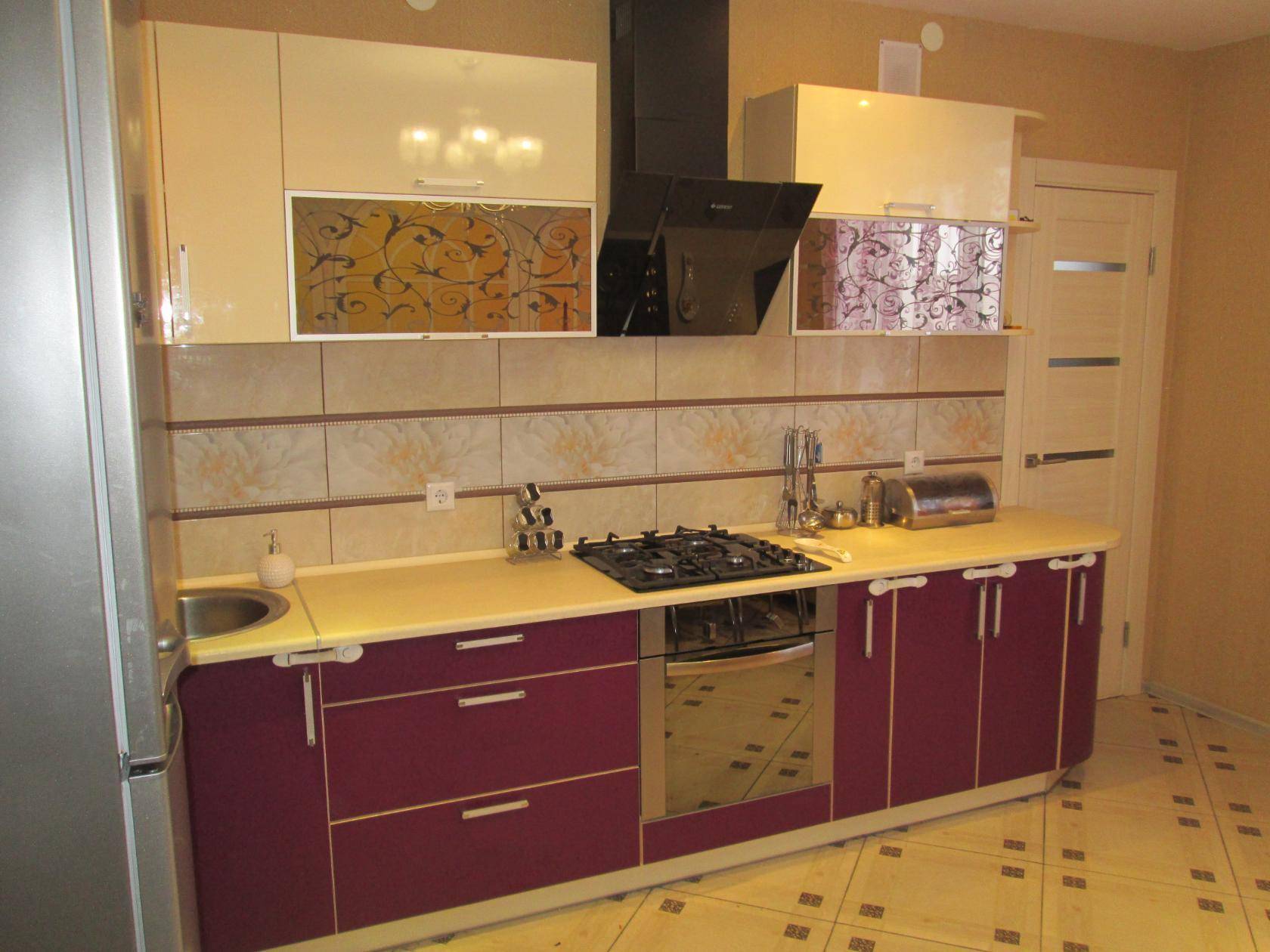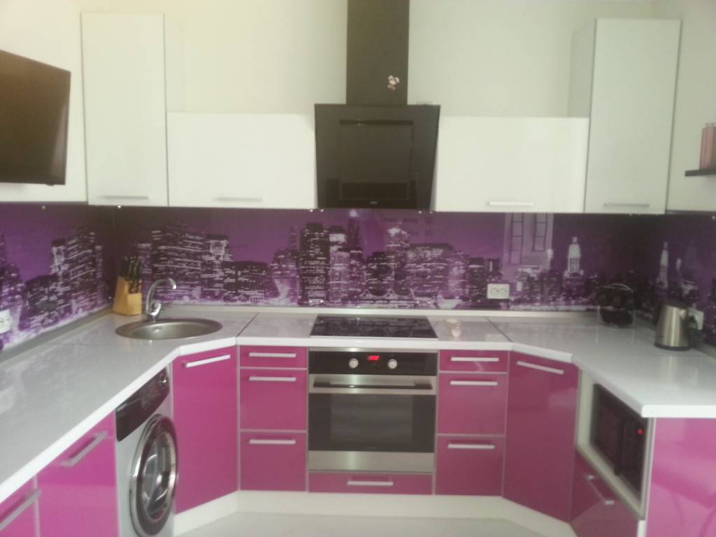 Еще один интересный вариант — стеклянная панель баклажанового цвета с нанесенным принтом и скрытой подсветкой. Таким образом вы получите насыщенный и объемный рисунок, который станет настоящим украшением вашей кухни.