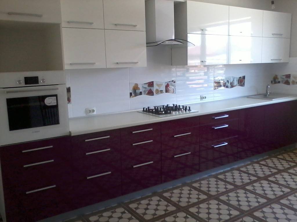 Баклажанные гарнитуры лучше смотрятся в глянце, поскольку блестящие поверхности раскрывают всю красоту цвета и выгодно подчеркивают его. Матовые фасады существенно проигрывают им.