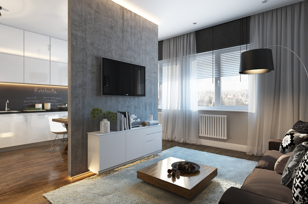 Для разделения кухни и гостиной применяется небольшая перегородка из гипсокартона, на которую можно повесить телевизор