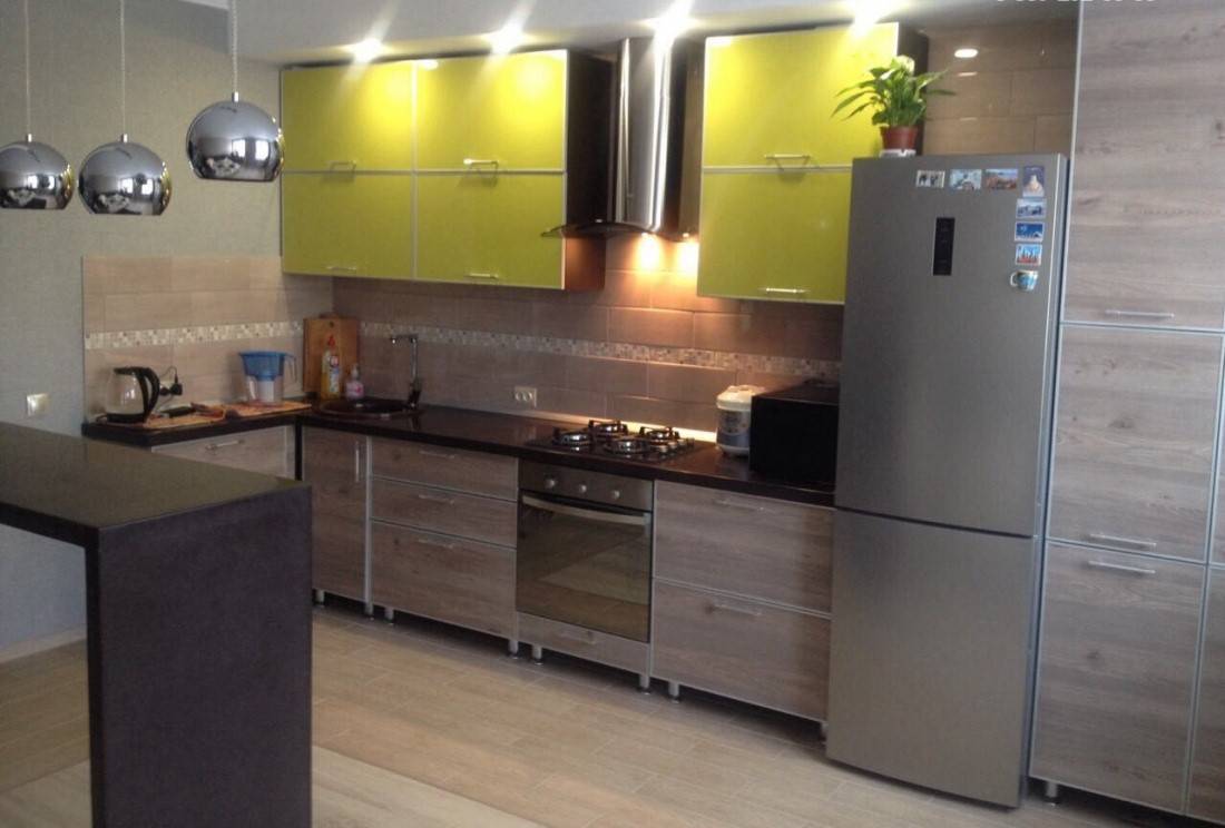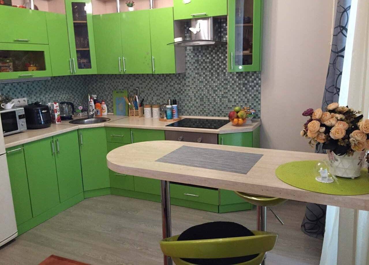 Под гарнитур с глянцевыми фасадами можно подбирать стол, изготовленный из пластика или стекла и металла. Вместо обеденного стола можно поставить барную стойку в тон фасадов гарнитура, а к ней — барные стулья с оливковыми сидениями.