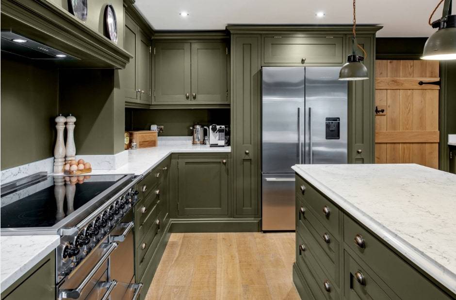 В большинстве каталогов представлены классические кухни именно в оливковом цвете. Это прекрасный вариант для тех, кто выбирают универсальное оформление, которое будет актуальным долгие годы. Тем более что с ним великолепно смотрится техника и аксессуары в стиле ретро. В свою очередь, для столешницы преимущественно используют мрамор в различных оттенках.