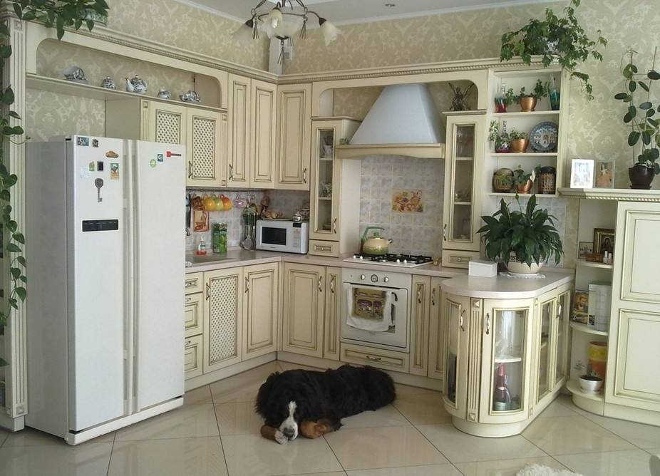 Угловая кухня «прованс» с мозаичным фартуком и рабочей зоной вместо подоконника