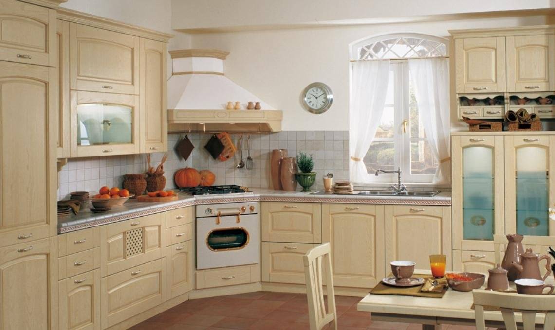 Фасады рамочные, простые, с резьбой в виде плетения или с винтажными стеклянными вставками. Цветовые оттенки гармоничны с природой, солнцем, морем, выжженной травой