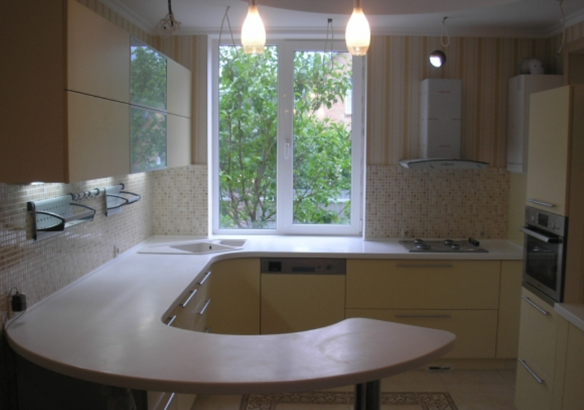 Обеспечивает максимальную практичность планировки, экономию пространства и удобство для хозяек. В таком случае подоконник расширяется в виде столешницы, на нем можно нарезать овощи, готовить пищу. Некоторые виды дизайна предусматривают установку на такой рабочей зоне варочной плиты, мойки.