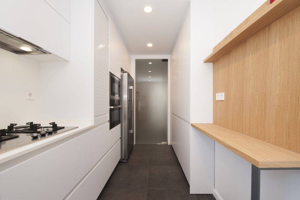Планировка в два ряда. Подходит, если коридор достаточно широкий, чтобы кухонный гарнитур и бытовую технику расположить по длинным сторонам комнаты. Здесь вряд ли найдётся место для стола, зато легче организовать рабочий треугольник. Подобный дизайн кухни с коридором напоминает корабельный камбуз; здесь может быть достаточно тесно, и хозяйствовать вдвоём уже не получится.