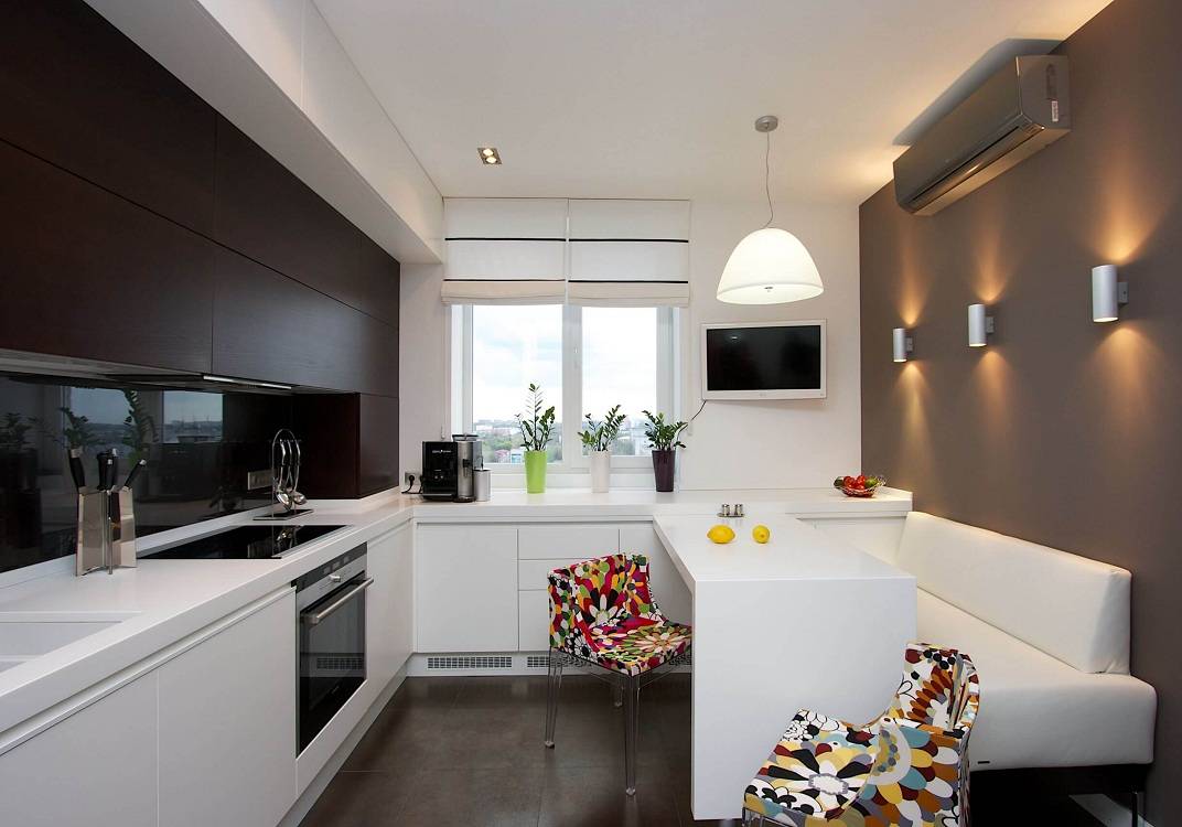 Неплох для дизайна небольшой кухни 7 кв м стиль модерн. Его удобство и практичность обусловлены присутствием встроенной техники. Цветовая гамма в таком интерьере разнообразна, но непременно гармонична. Освещение тоже доверено встроенным светильникам.