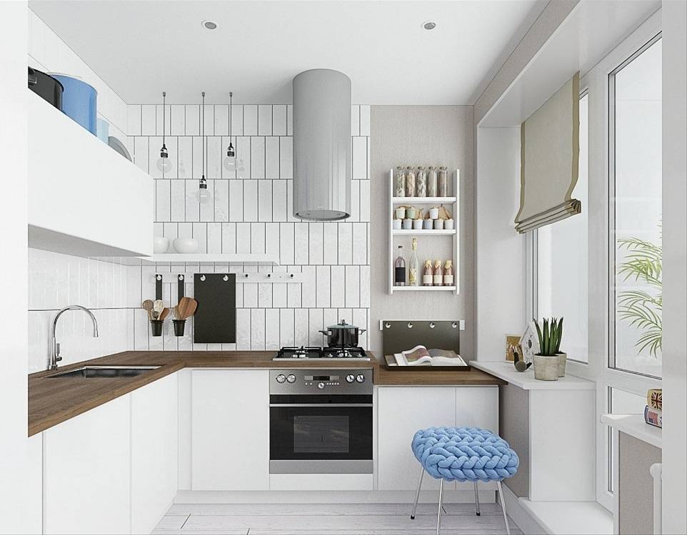 Чтобы вписать угловой гарнитур в маленькое пространство, можно задействовать зону под окном, выходящим на лоджию. Для этого нижнюю часть проема закладывают до уровня рабочей столешницы, вдоль перегородки располагают полезные шкафчики для хранения. Обеденная мебель в таком случае устанавливается у противоположной стены.