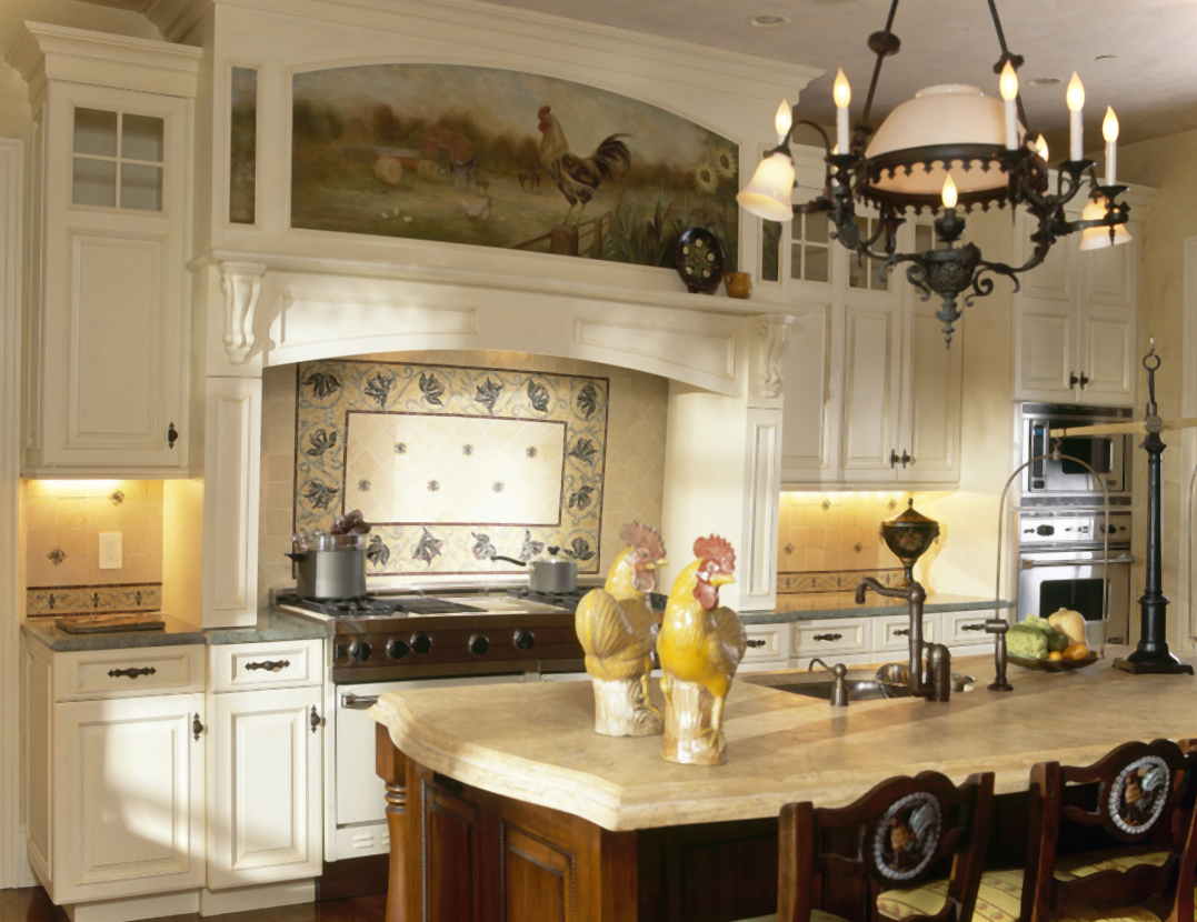 Освещение кухни должно быть традиционным, без модного точечного освещения. Подумайте о классической массивной хрустальной люстре, нескольких лампах, размещенных в разных зонах, и стоячий светильник для локального мягкого света.