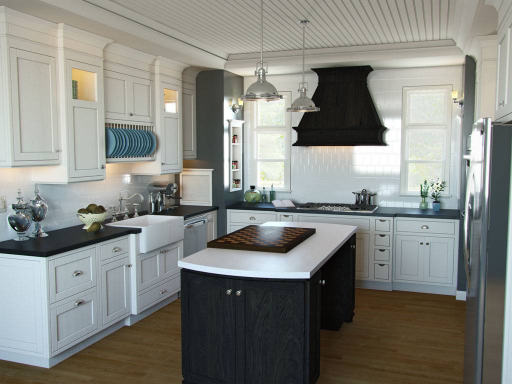 Потолки на кухне идеально будет оштукатурить и покрыть светлой краской. Можно так же использовать декоративные деревянные балки для оформления.