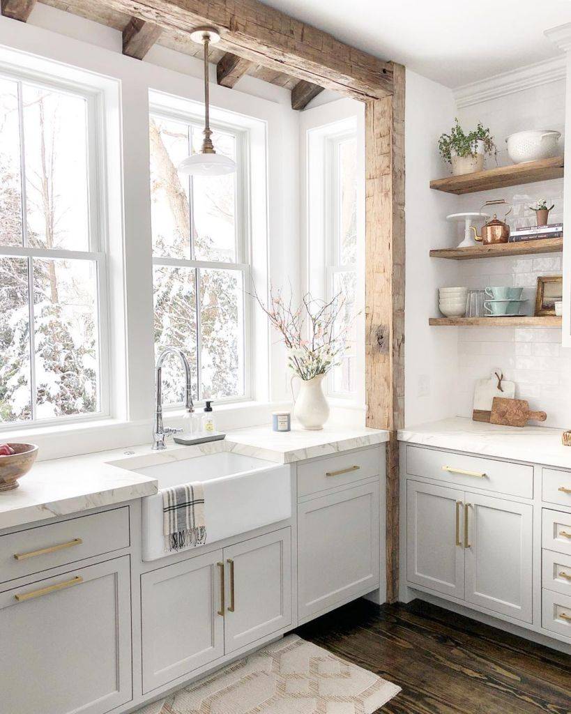 Если кухня в доме выполнена из профилированного бруса, то с прямоугольными чертами очень хорошо будет смотреться белоснежная или бежевая кухонная мебель. Чтобы она повторяла черты отделки стен, можно заказать фурнитуру того же цвета, фактуры и материала.