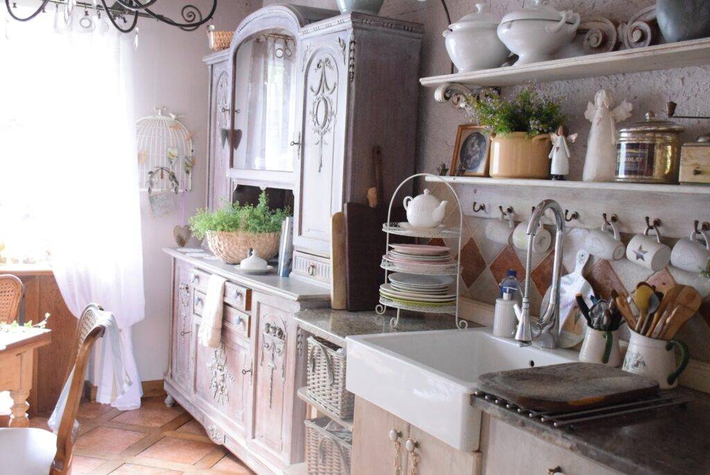 Также приветствуются различные цветочные либо клетчатые узоры, интересная вышивка и рюши, украшающие скатерть и салфетки. Такие, казалось бы, мелкие детали и делают кухню в этом стиле по-настоящему домашней и гостеприимной.