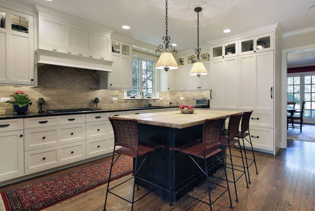 Защищенный таким образом пол также будет легко мыть, что тоже немаловажно, ведь на кухне очень легко испачкаться. Кухонный фартук можно сделать из плитки. Он тоже могут быть белый, но не обязательно. Важно, чтобы он хорошо гармонировал с другими элементами интерьера.