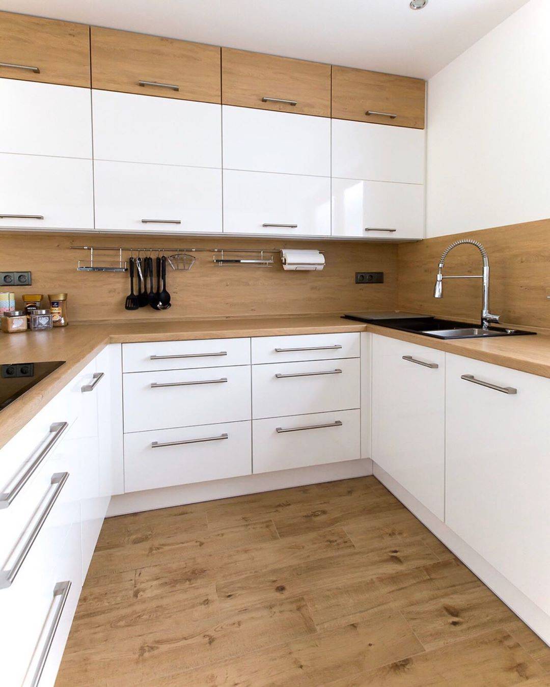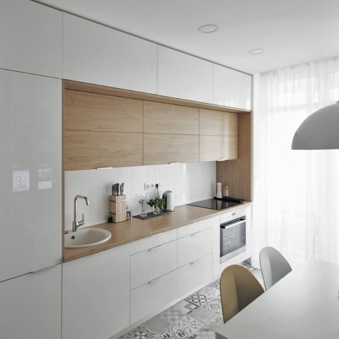 | Рис. 24. Кухня белого цвета со шкафами древесного декора |