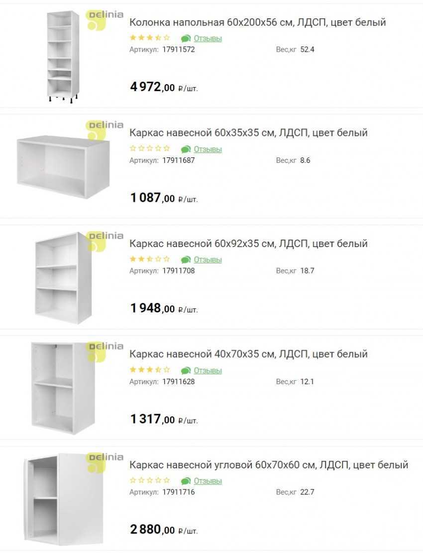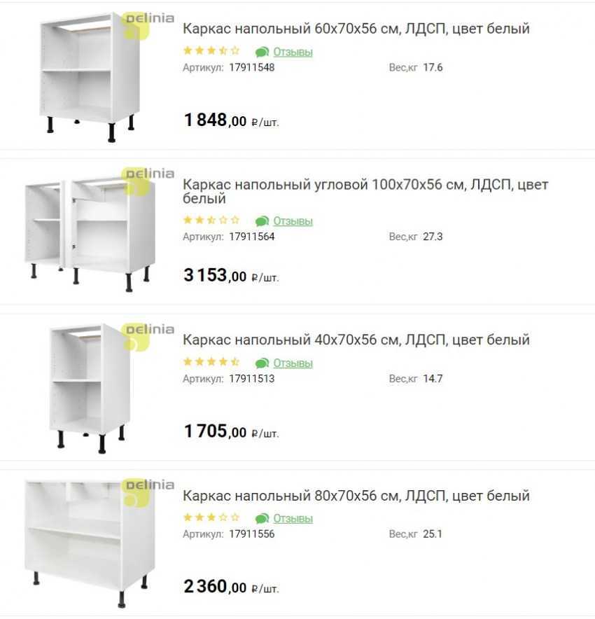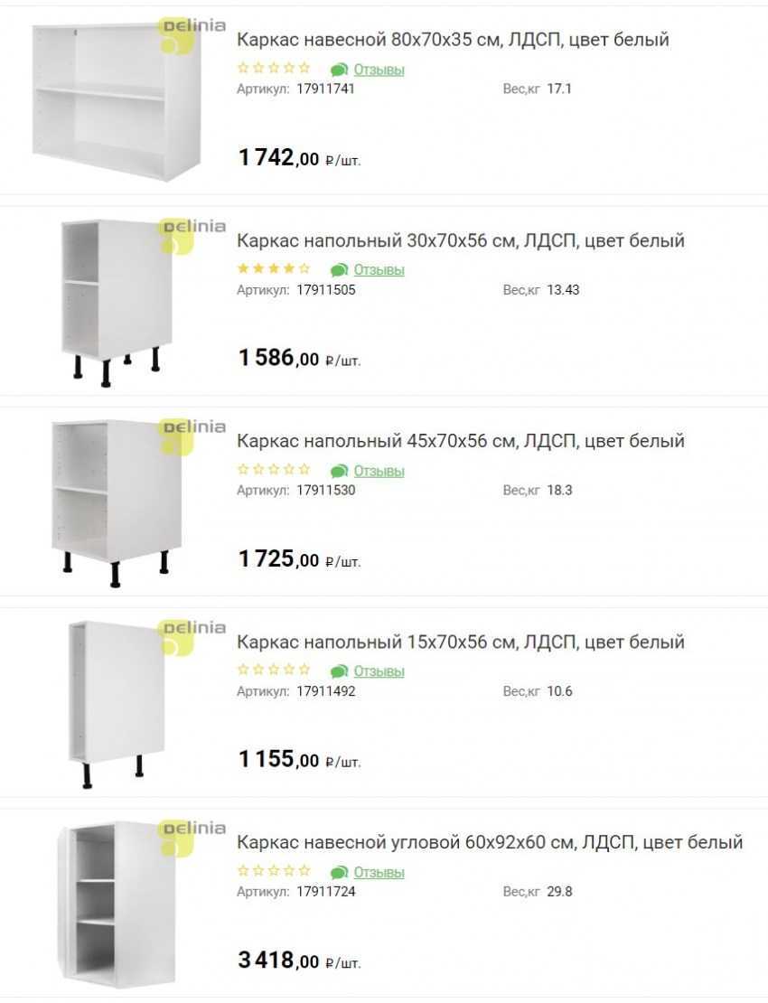 Стоимость верхних шкафов начинаются от 450 руб., на напольные тумбы – от 1000 руб.