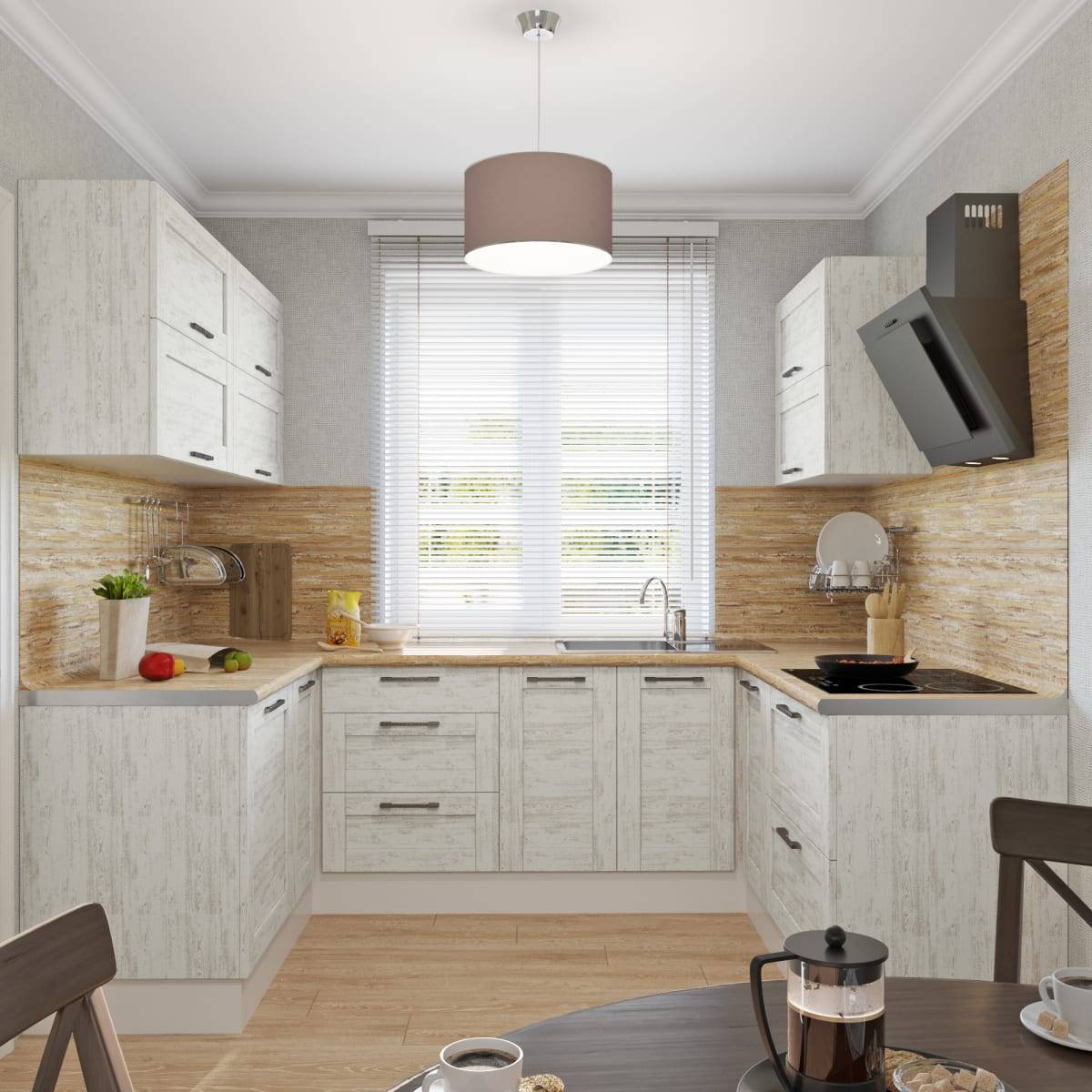Нужно соблюдать точность в размещении проемов и особенностей конструкции кухни, чтобы гарнитур идеально вписался в комнату.