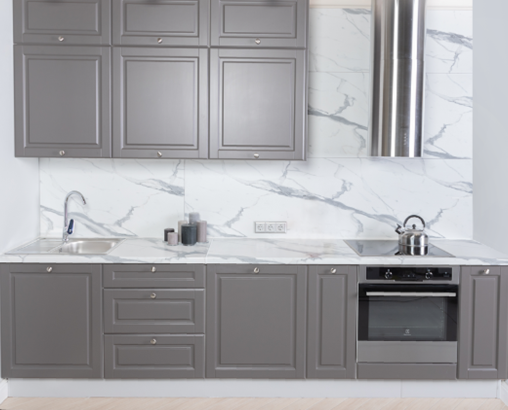 Проект серой кухни фрейм покрытой меламиновой пленкой.