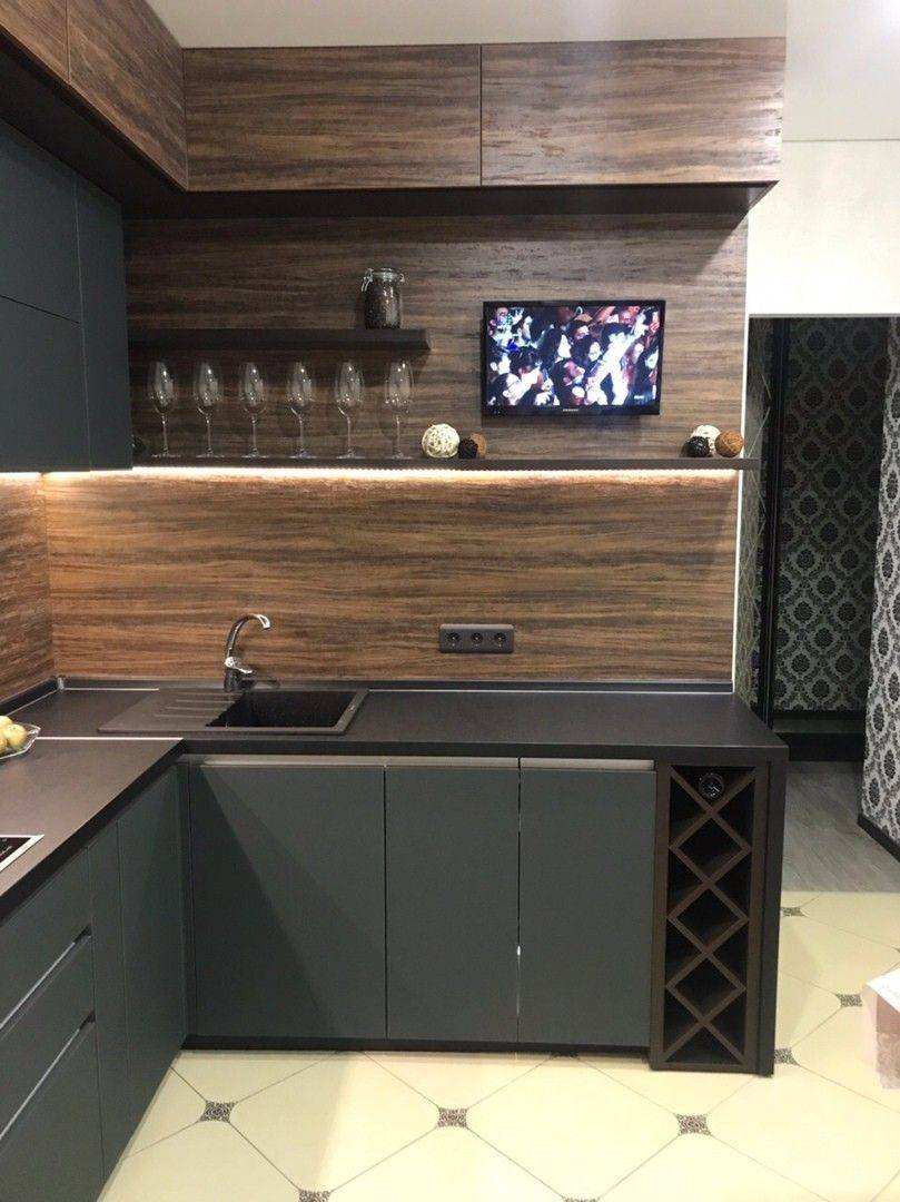 - Очень удобно, когда рабочая поверхность подсвечена диодами, закрепленными на донце навесных шкафов, как на фото.