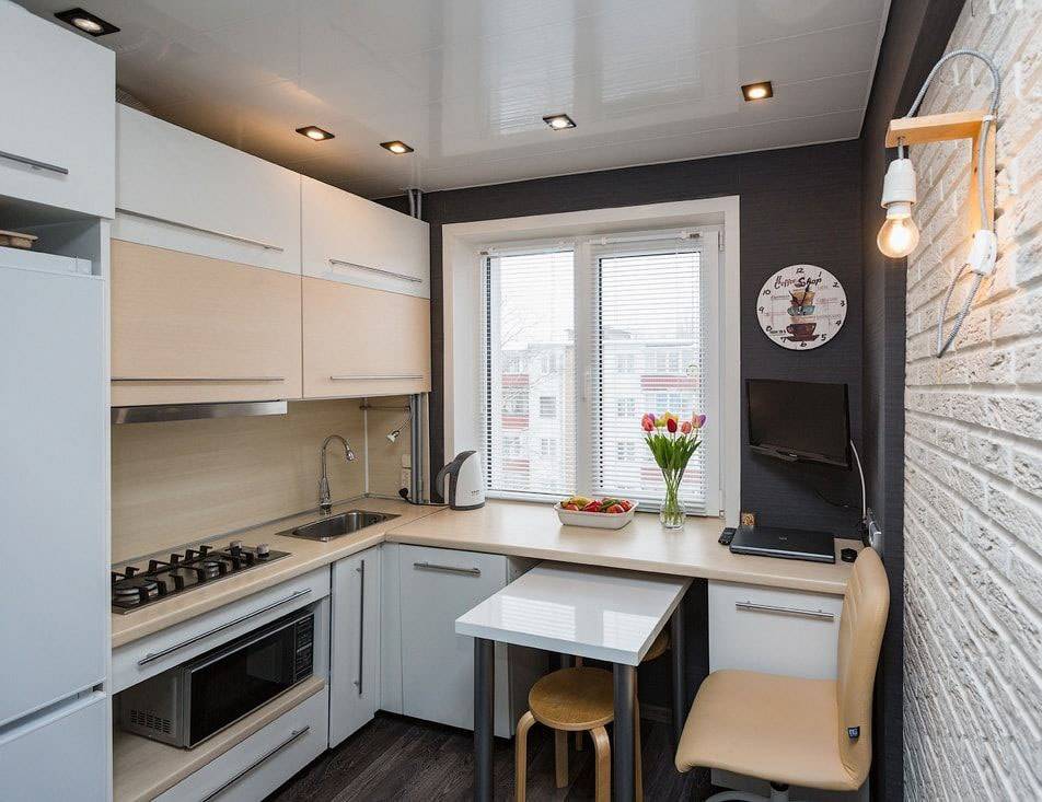 Очень уютная кухня получается даже в обычной «хрущевке», если с умом задействовать подоконник. В данном случае подоконник заменяется полноценной рабочей поверхности, которая также может использоваться в качестве обеденного места. Из-под нее выдвигается компактный и лаконичный столик белого цвета, который может применяться для того, чтобы покормить большее количество людей. Сам гарнитур, кстати, оформлен с использованием спокойного бежевого и белого оттенков, создающих приятную атмосферу и визуально расширяющих пространство.