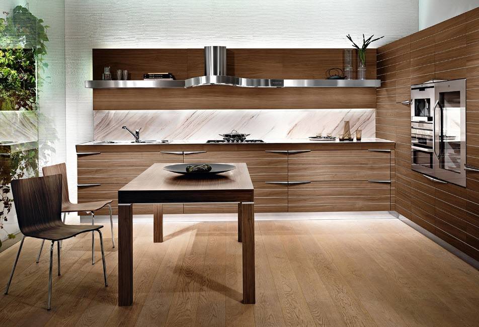 Актуальные отделочные материалы – металл, стекло, дерево, натуральный камень, керамика. На бытовой технике экономить не стоит. В настоящее время современным техническим требованиям соответствуют микроволновки, холодильник, интегрированные поверхности, духовой шкаф. Освещения должно быть много. Играя с цветами и яркостью света можно зонировать кухню. Светильники должны соответствовать стилю помещения.