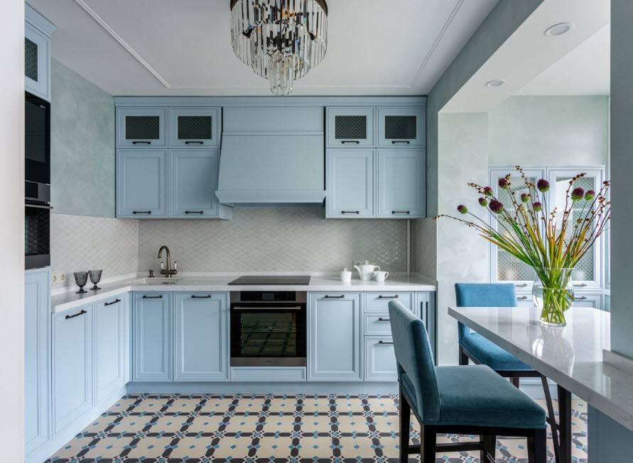- мебель должна быть в белой или светлой гамме, желательно выбирать глянцевые поверхности, а верхние шкафчики закрывать фасадами со вставками из стекла;