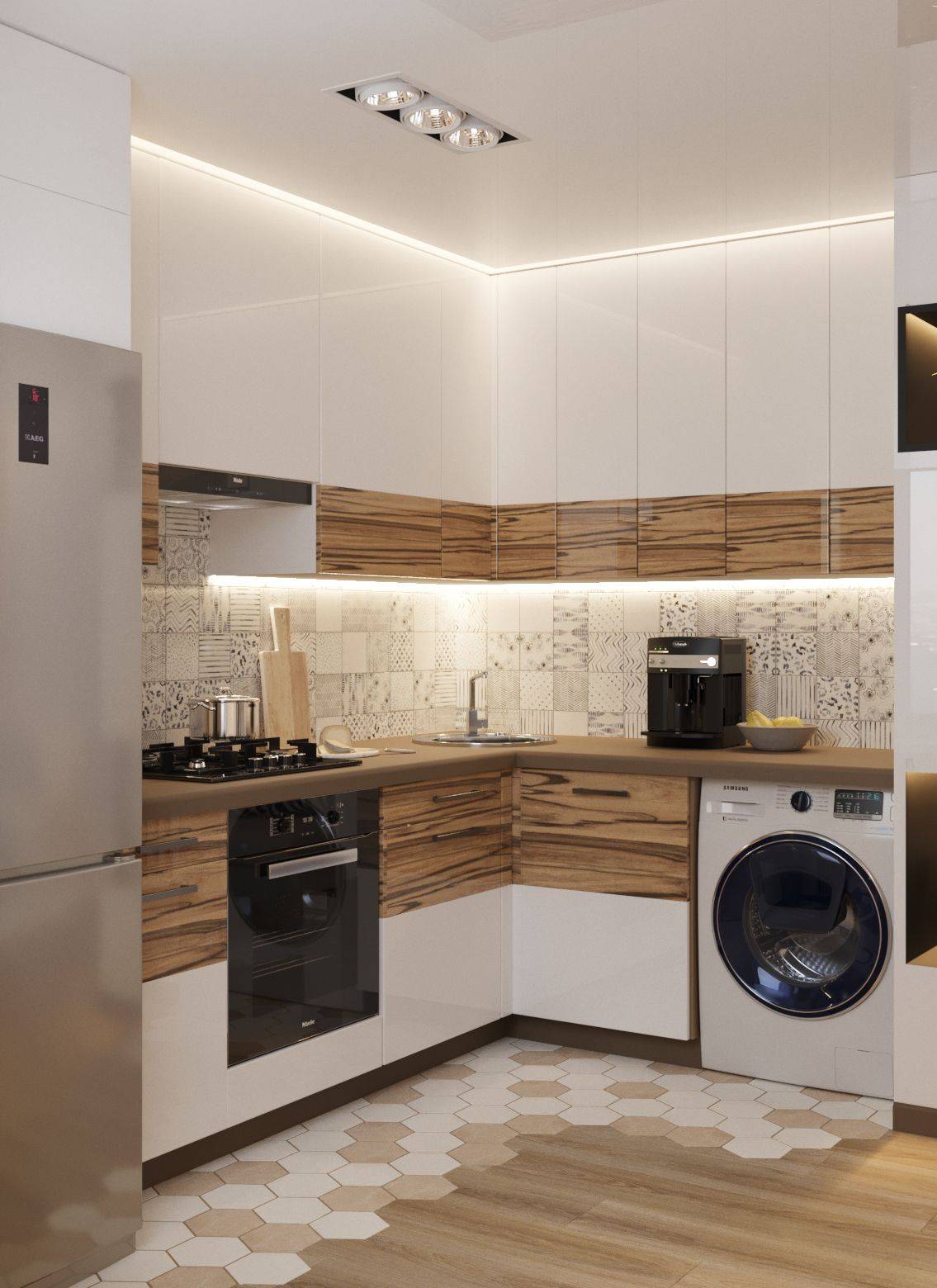 Места мало, но выхода нет — нужно вместить максимум полезной техники на нескольких квадратах. Естественно, для экономии пространства и визуально гармоничного оформления рекомендуем либо вмонтировать стиральную машинку, либо спрятать ее в один из кухонных шкафчиков. Отдельно стоящая машинка совсем не вариант. Вот несколько советов, которые упростят задачу: